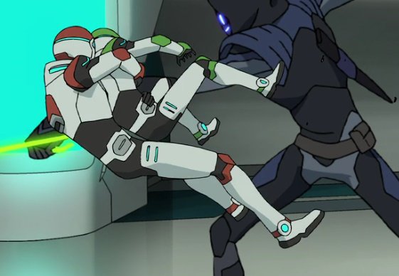 Wow, Keith's secret anime watching habits come to light.It seems like a bad idea to start walking across that narrow strip of floor before Keith's finished, so Allura stands nearby — close enough that she might lunge over and grab him if he does start to slip — and starts pointing the flashlight down the hole.